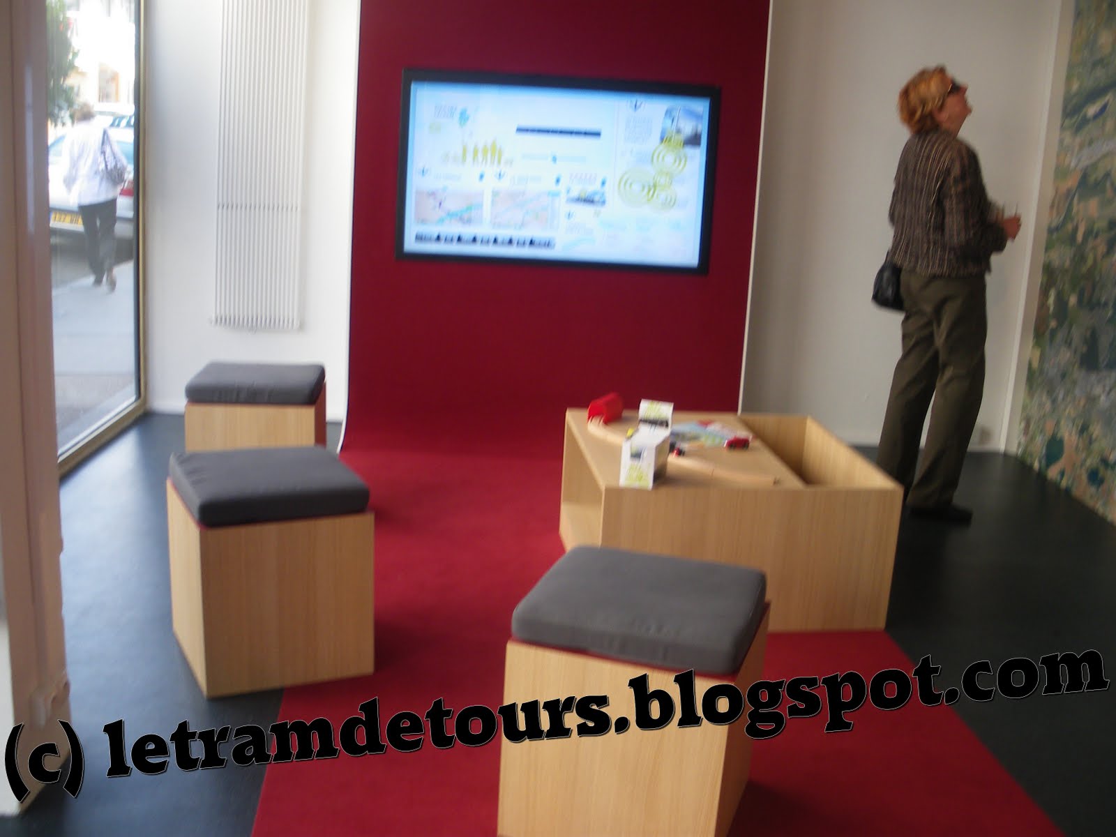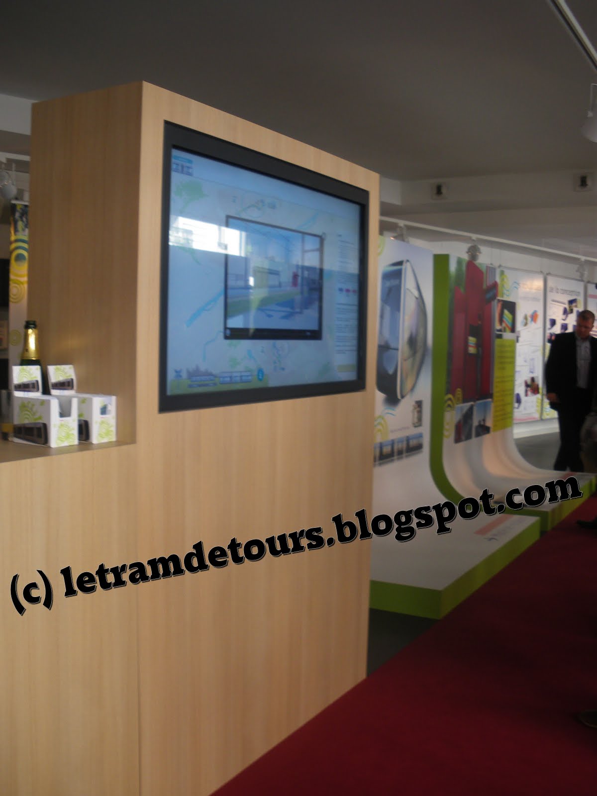 – 2 écrans tactiles (dont 1 situé dans le « coin enfants ») permettant de visualiser le tracé de façon interactive, une rame (intérieur et extérieur), les stations ainsi que le calendrier des travaux sur une carte.