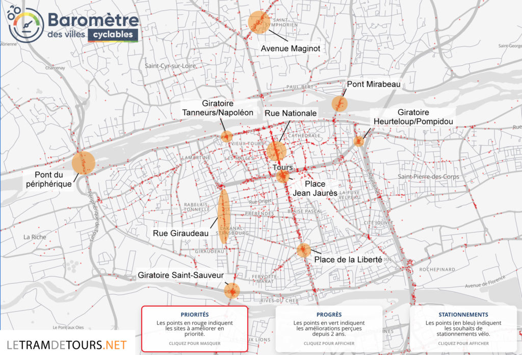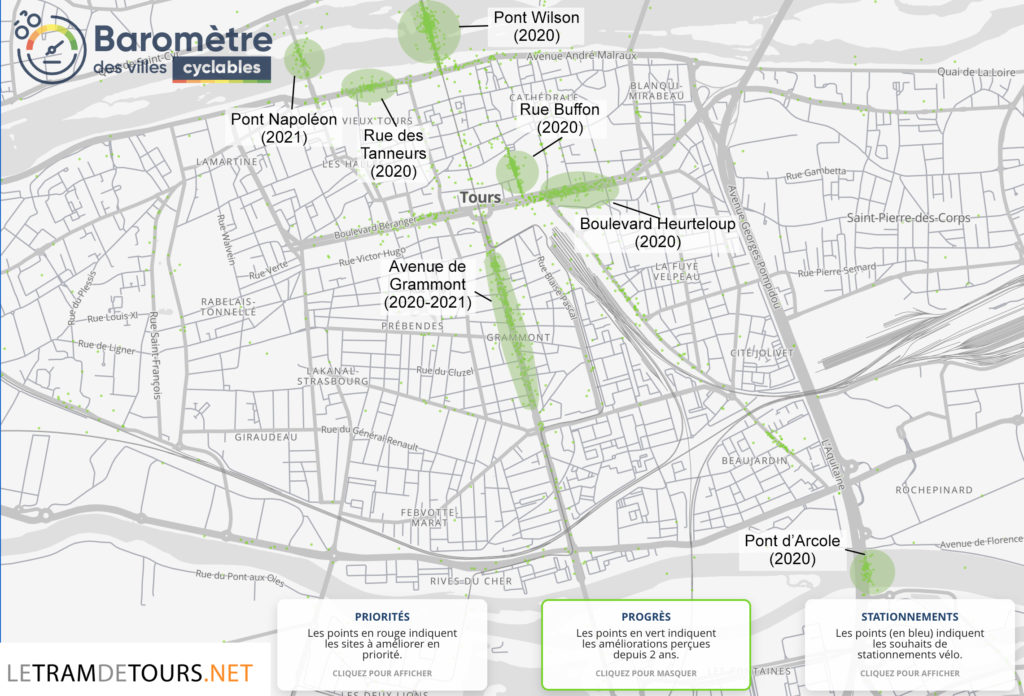 Etant donné le nombre important de participants pour la ville de Tours, la cartographie est extrêmement parlante. Les progrès sont localisés et se limitent aux aménagements menés dans le cadre du réseau cyclable transitoire. Initié en 2020 par Tours Métropole Val de Loire à la sortie du premier confinement, rappelons qu’il demeure en grande partie inachevé. Rue Buffon, la création d’une piste cyclable bidirectionnelle de qualité est saluée, bien que son prolongement jusqu’à la Loire via la rue Voltaire ne semble plus être à l’ordre du jour.