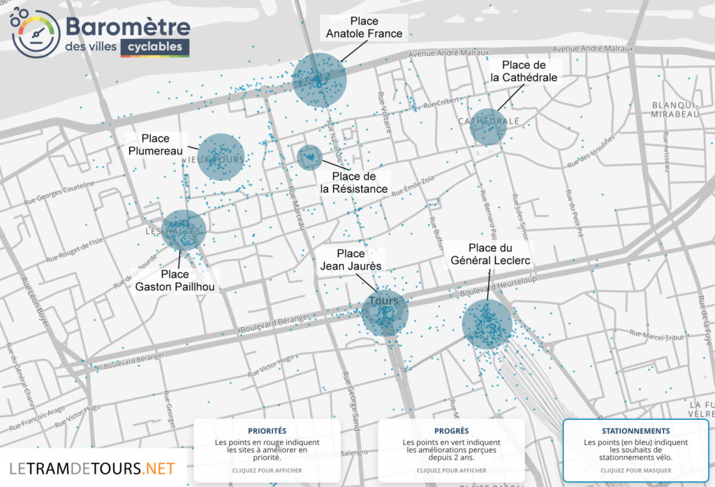 Dernier volet du baromètre des villes cyclables, les cyclistes étaient invités à localiser les espaces où ils souhaiteraient voir davantage de stationnements pour leur vélo. Le centre ancien regroupe la majorité des réponses avec des demandes qui se concentrent autour des places Plumereau, Anatole France, des Halles et Jean Jaurès. Les abords de la gare sont également cités. C’est à cet endroit qu’a été inauguré en fin d’année un garage à vélos sécurisé de 168 places. Preuve, s’il en fallait une, que les choses avancent.