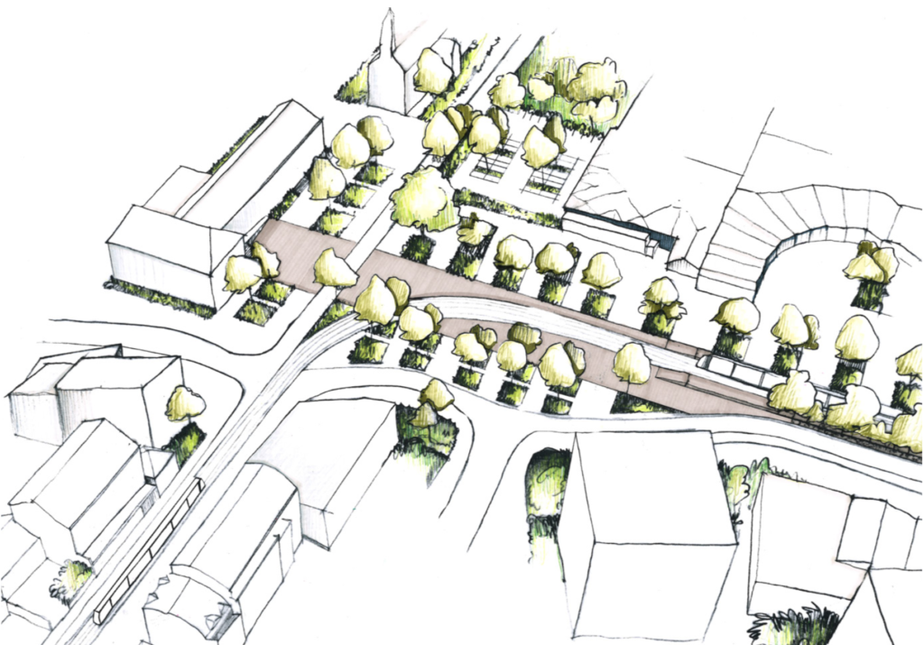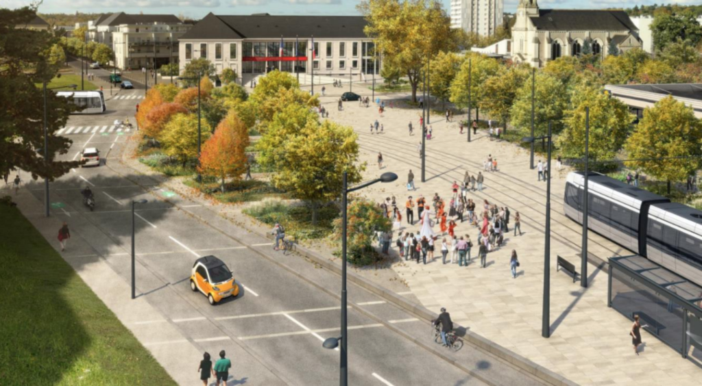 La place du Général Leclerc, située devant la mairie, va elle aussi être profondément réorganisée. Des arbres seront plantés, les voies de circulation seront déplacées et l’actuel rond-point disparaitra. Les plus observateurs relèveront que les immeubles de la rue de la Mairie voués à la destruction figurent tout de même sur cette esquisse.