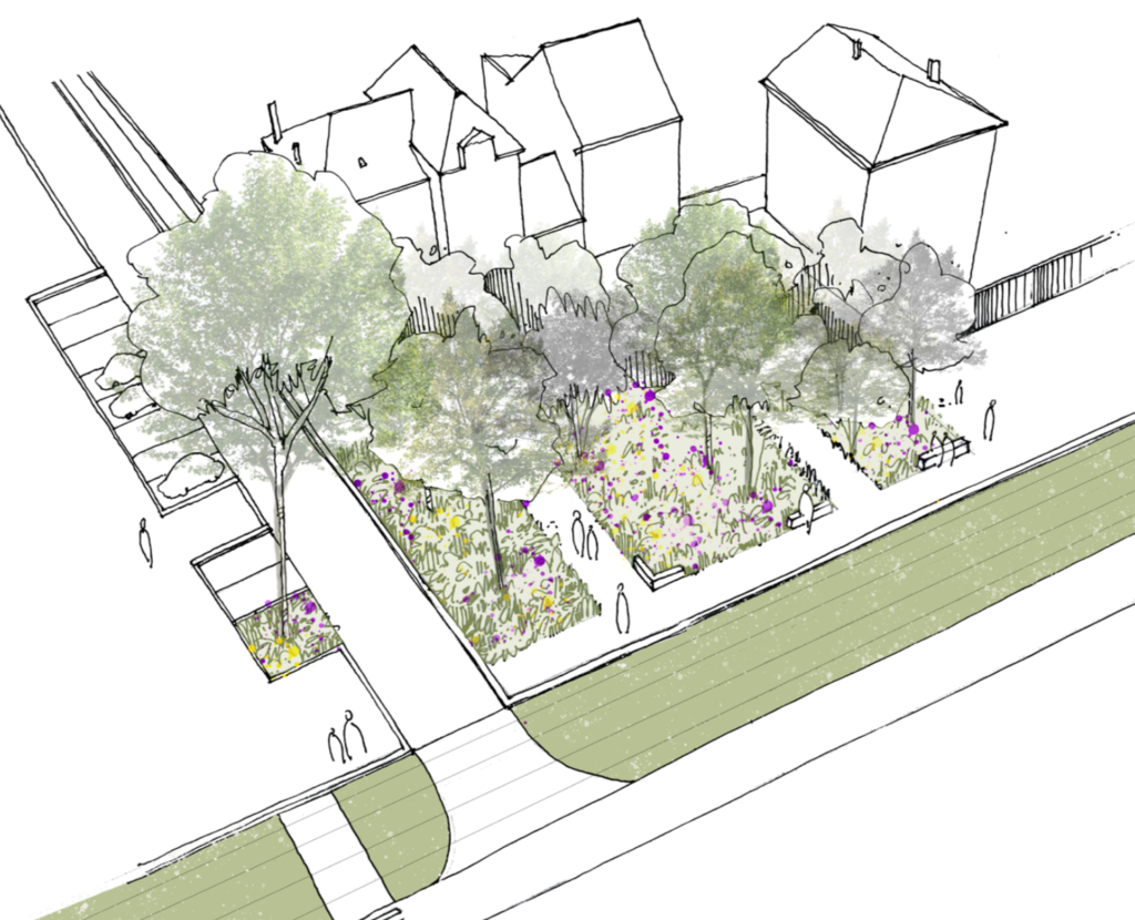 Même constat rue Michel Baugé, dont seul le sens de circulation ouest-est sera maintenu. La place Hélène Bouchet, à l’entrée du futur quartier Beaumont-Chauveau, sera totalement requalifiée et pourrait donner lieu à la création d’un jardin public comme le suggère ce croquis.