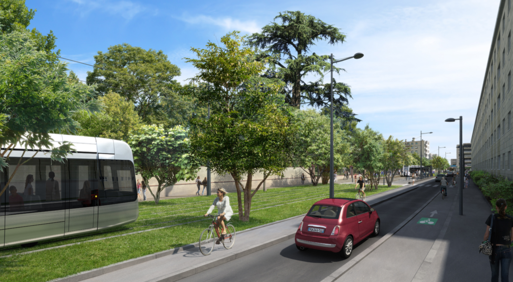 La ligne B tournera ensuite pour emprunter sur 350 mètres le boulevard Tonnellé sur une plateforme minérale. Le double-sens automobile sera maintenu, mais les aménagements cyclables seront aux abonnés absents malgré le caractère structurant de cet axe. Là aussi, les cyclistes n’auront d’autre choix que de rouler au milieu du trafic.